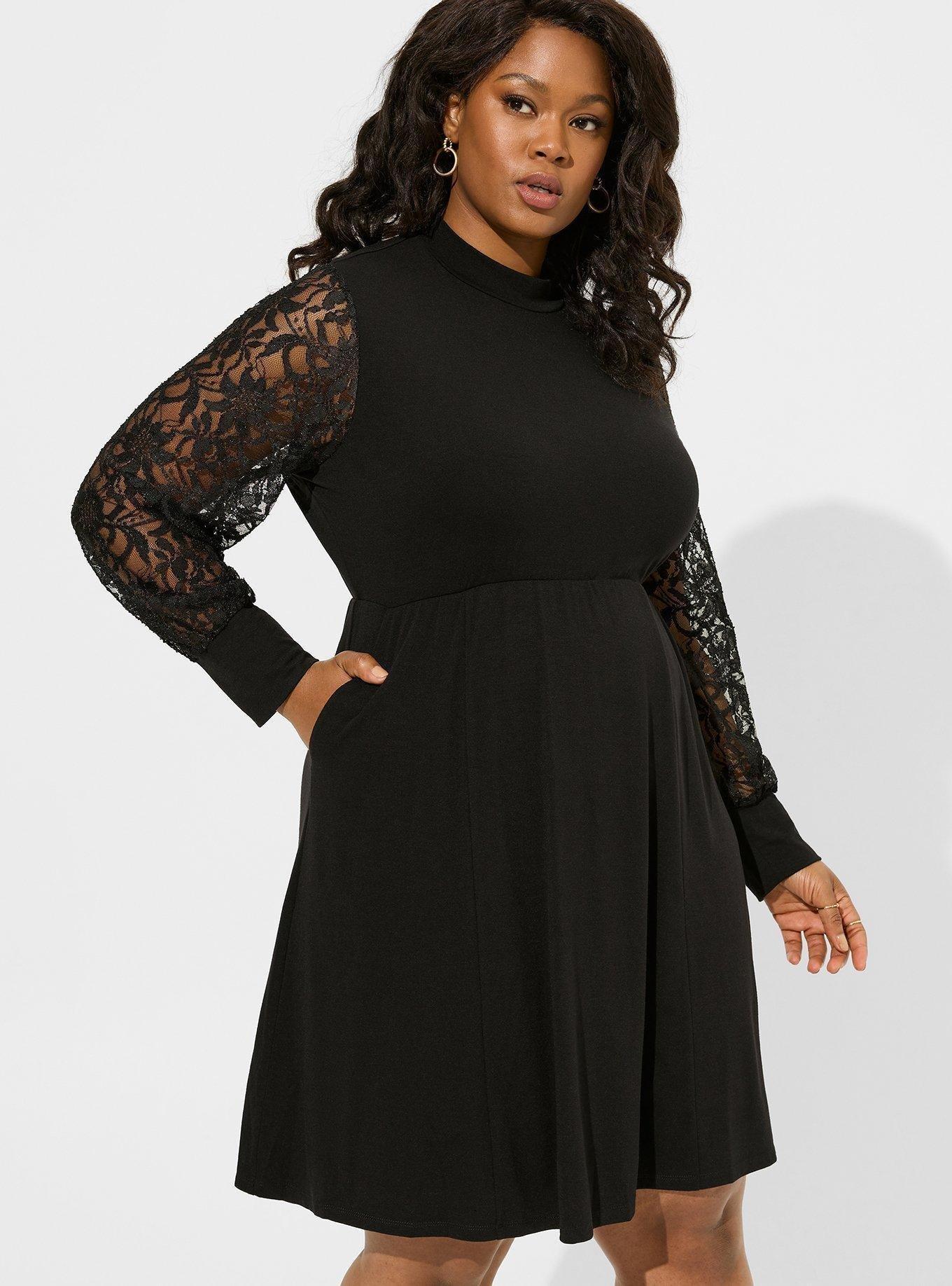 Black lace mock neck dress clearance, Plus Size At The Knee Jersey Lace Sleeve Mock Neck Skater Dress clearance