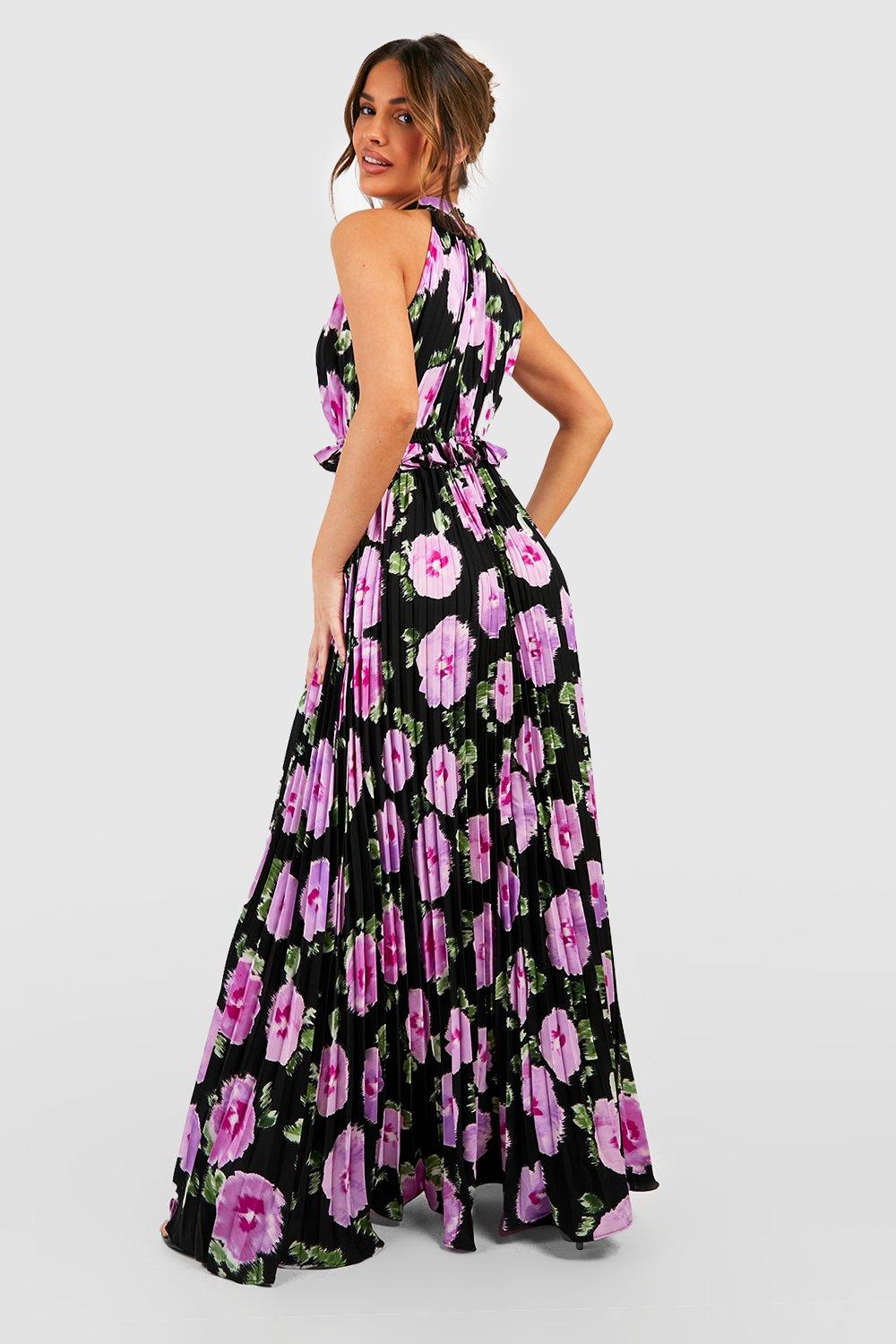 Black maxi dress with pink flowers clearance, Women s Floral Print Pleated High Neck Maxi Dress Boohoo UK clearance