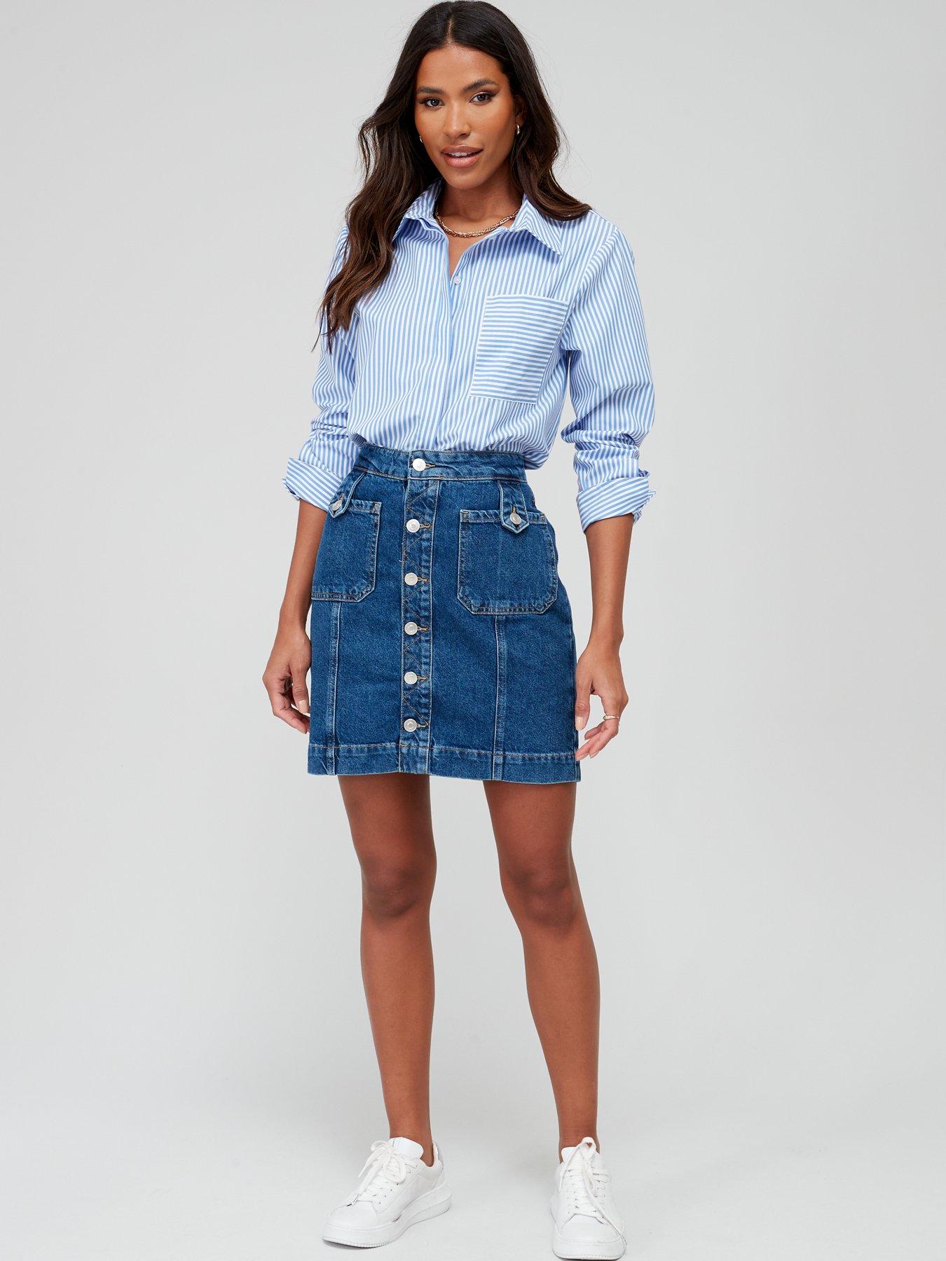 A line denim skirt button front clearance, Women s Wrap Button Front Asymmetrical Hem Denim Skort Pocket clearance