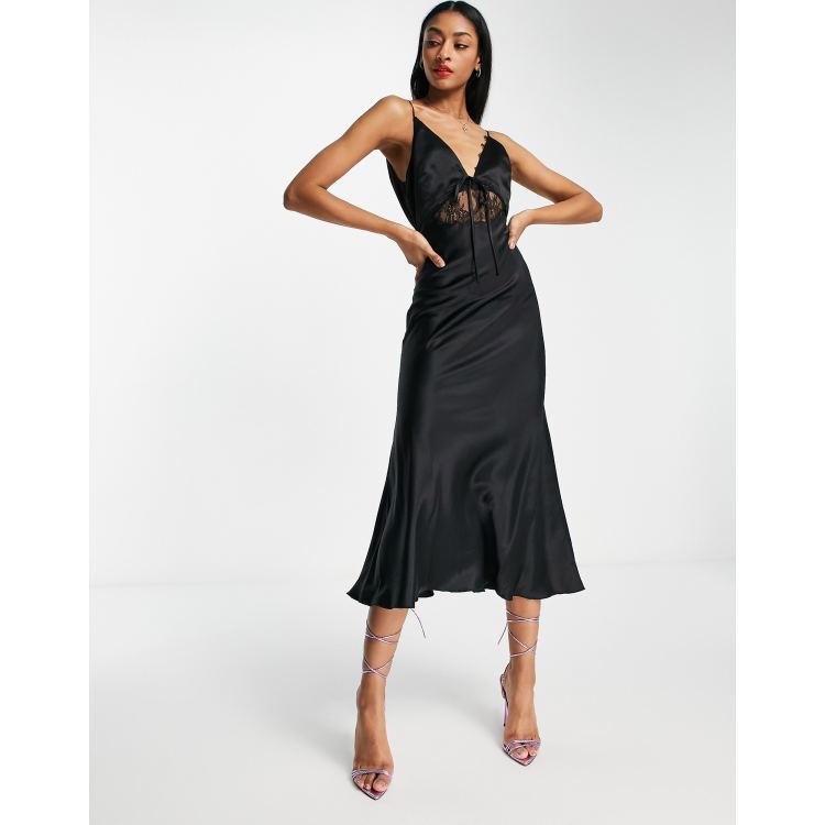 ASOS DESIGN bias satin midi slip dress with delicate lace detail