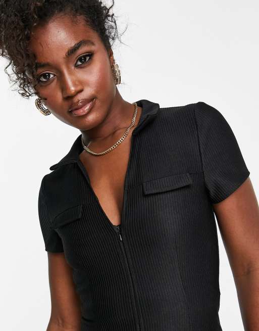 Black zip up playsuit clearance, ASOS DESIGN collar zip front 70s rib playsuit in black ASOS clearance
