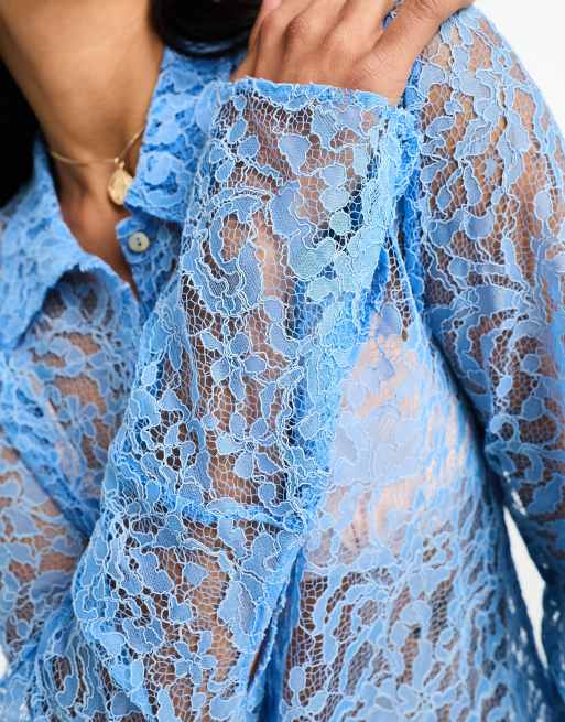 Topshop lace asymmetric hem long sleeve top in blue ASOS