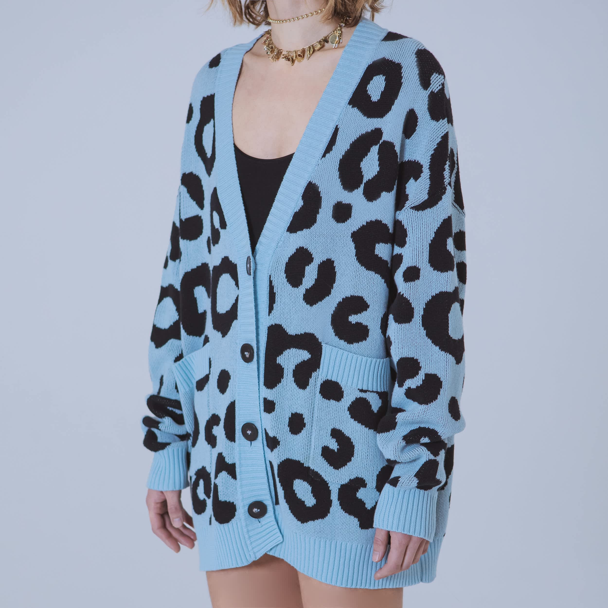 Georgia Light Blue Black Leopard Jacquard Long Cardigan Sveta