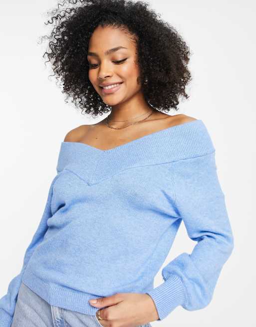 JDY shanon off shoulder fine knit jumper in blue ASOS