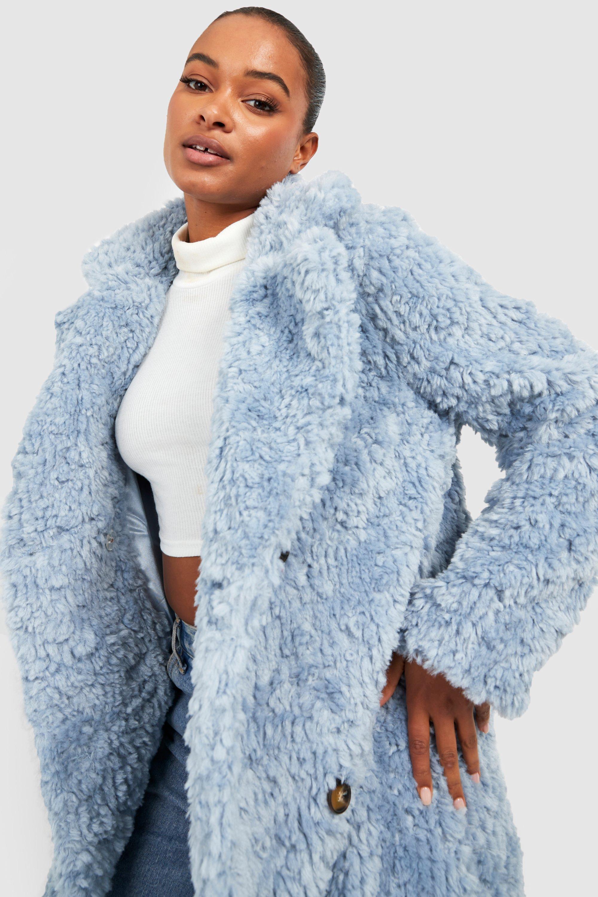 Blue teddy coat river island clearance, Tall Textured Faux Fur Double Breasted Coat boohoo clearance