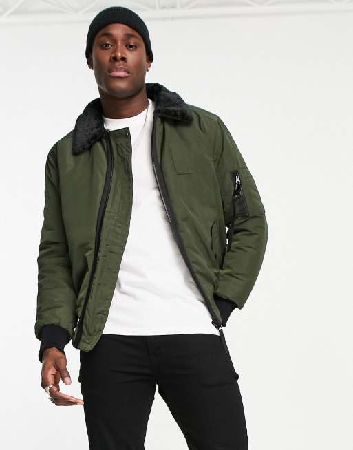 River Island MA1 sherpa collar bomber jacket in khaki ASOS
