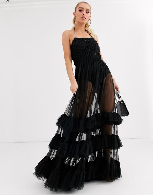 About you lace and beads clearance, Lace Beads embellished bodice tiered tulle maxi dress in black clearance