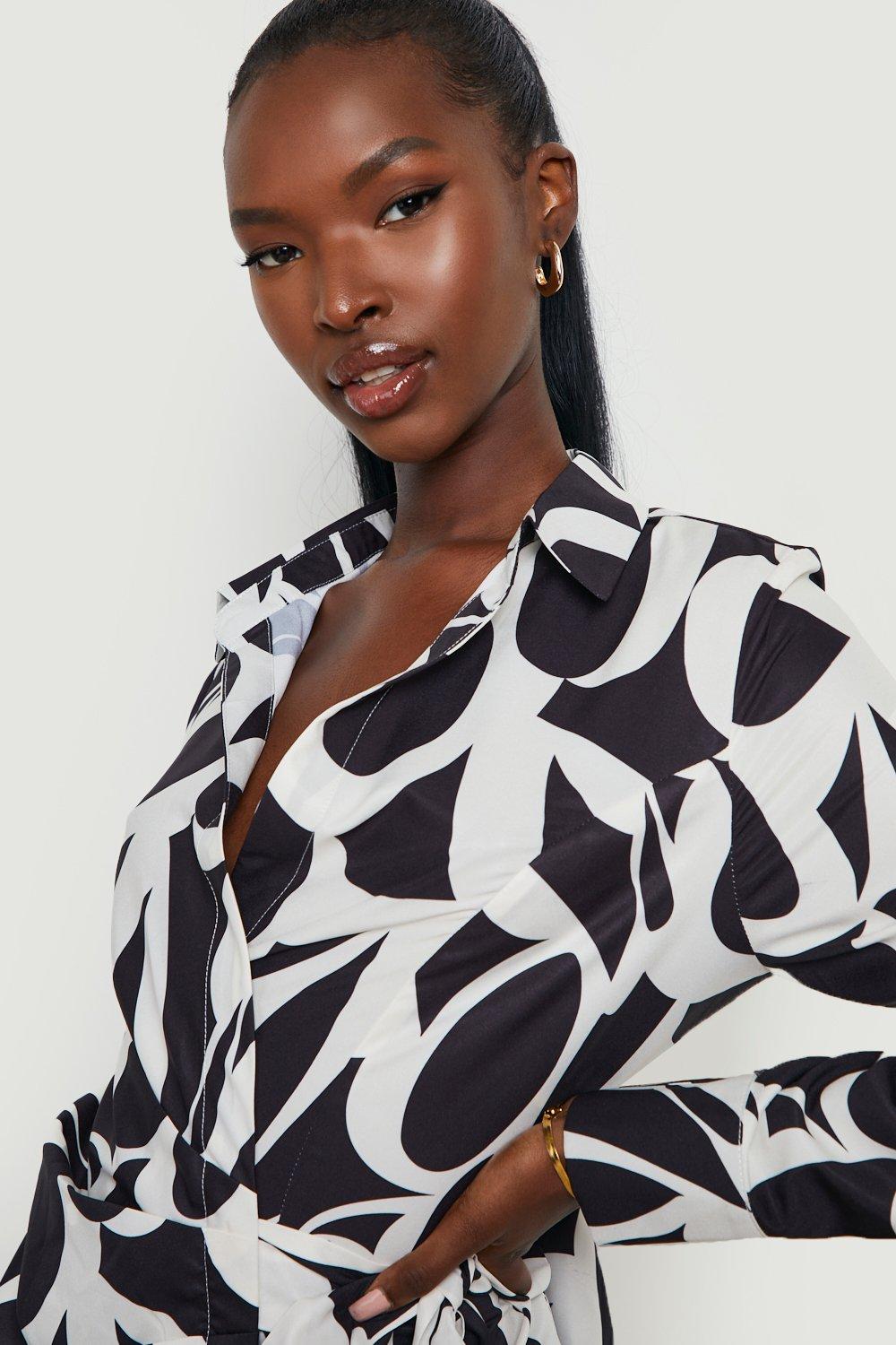 Women s Mono Printed Midi Wrap Shirt Dress Boohoo UK