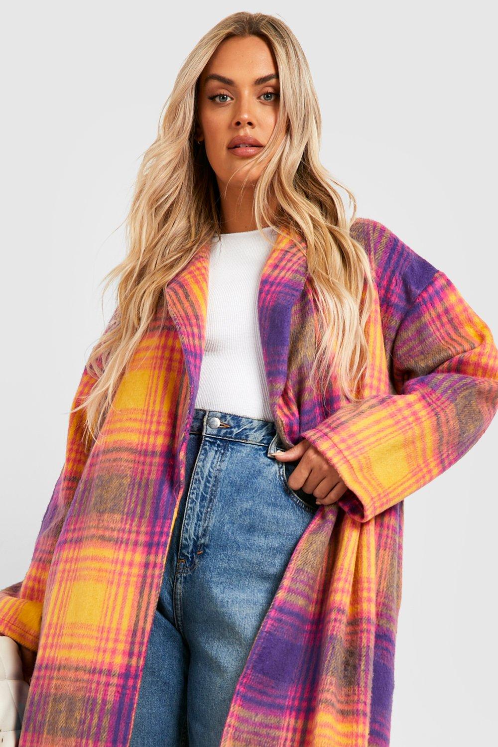 Women s Plus Brushed Bright Check Wool Look Coat Boohoo UK
