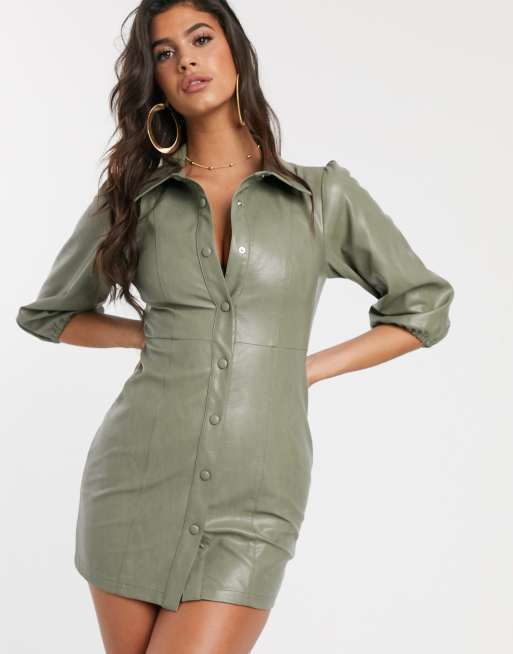 Boohoo leather look mini dress with puff sleeve in washed khaki ASOS