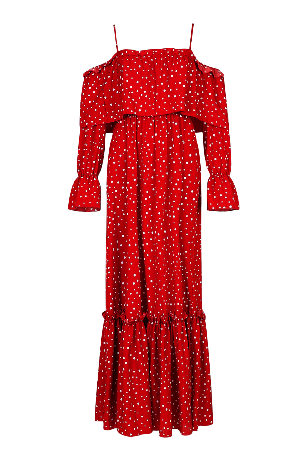 Boohoo red spotty dress clearance, Polka Dot Cold Shoulder Ruffle Maxi Dress boohoo clearance