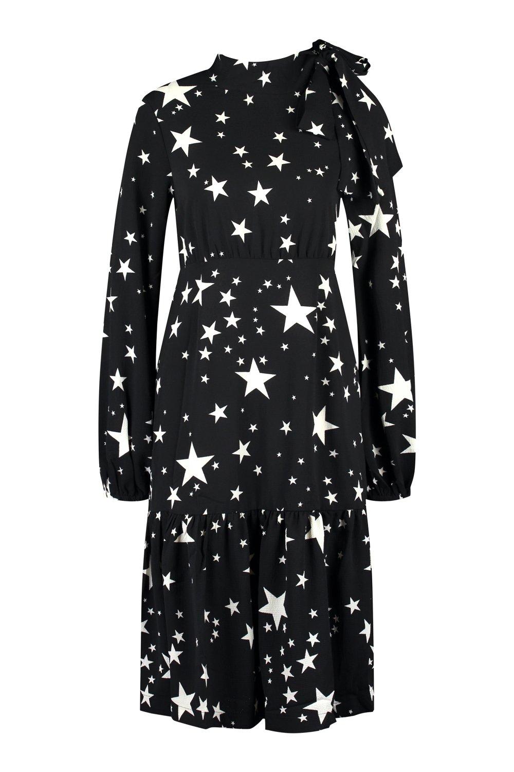 Boohoo star dress clearance, Star Print Tie Neck Midi Dress boohoo clearance