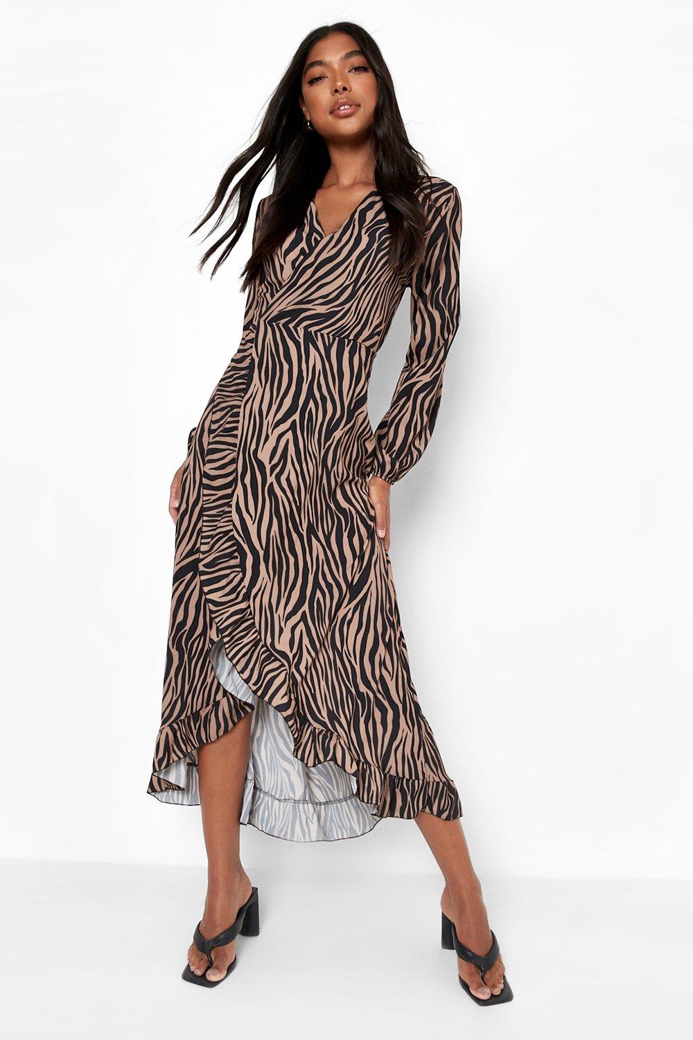 Women s Tall Tiger Print Ruffle Midaxi Wrap Dress Boohoo UK