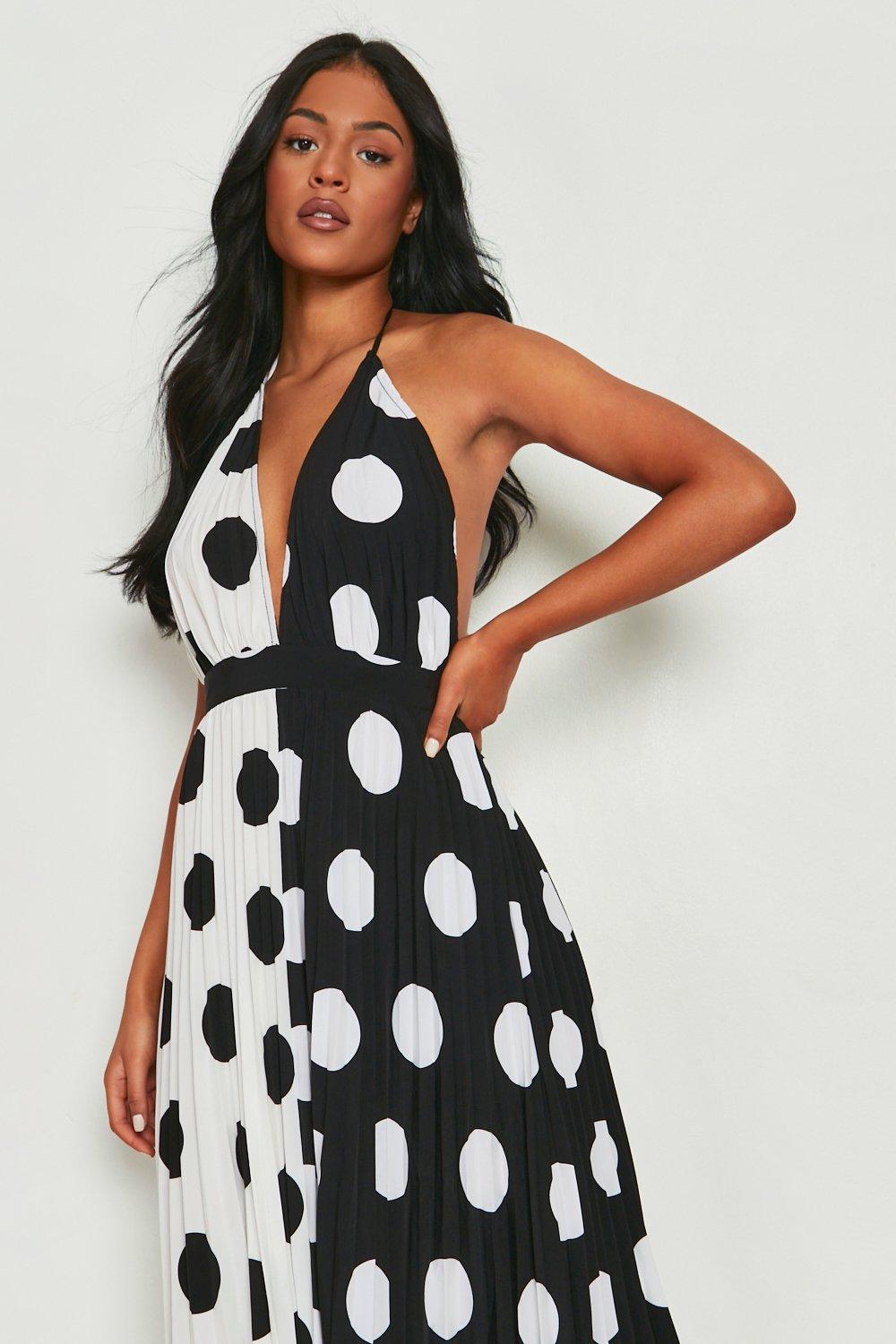 Boohoo white polka dot dress clearance, Women s Tall Contrast Polka Dot Pleated Midi Dress Boohoo UK clearance