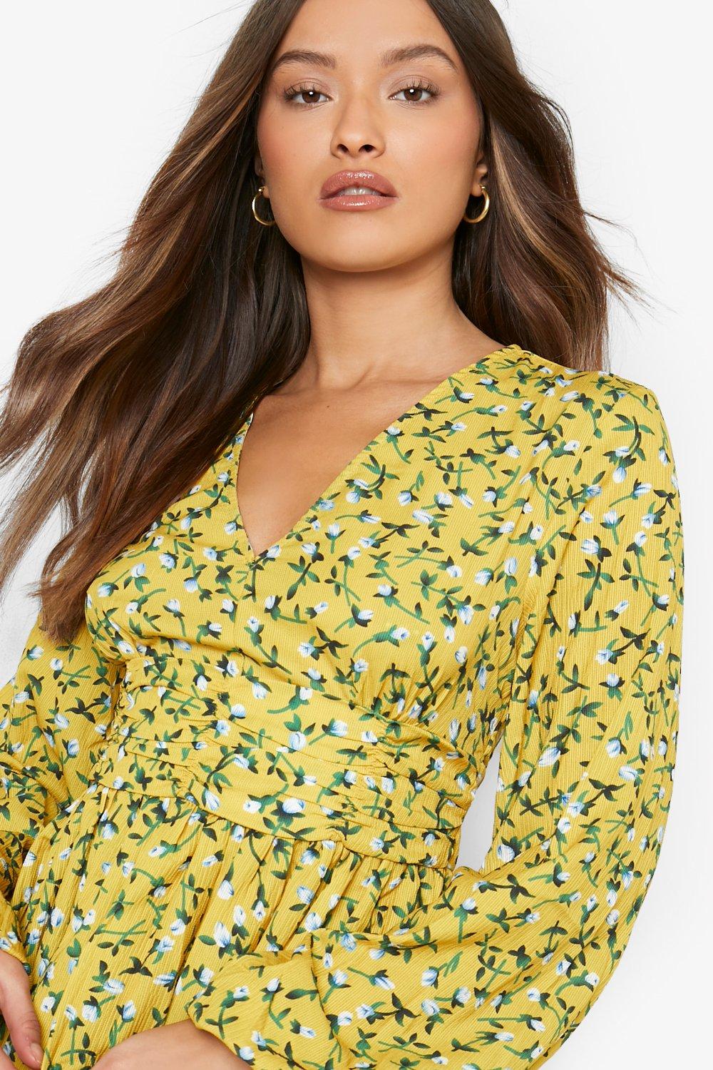 Boohoo yellow floral dress clearance, Women s Ruched Waist Floral Tea Dress Boohoo UK clearance