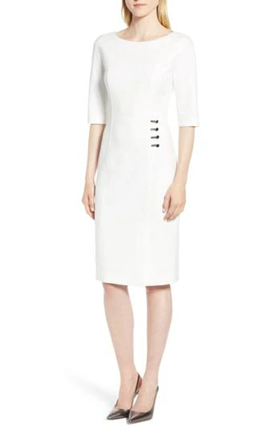 BOSS Disoma Body Con Half Sleeve Ivory Fitted Sheath Dress with Metal Accents 0