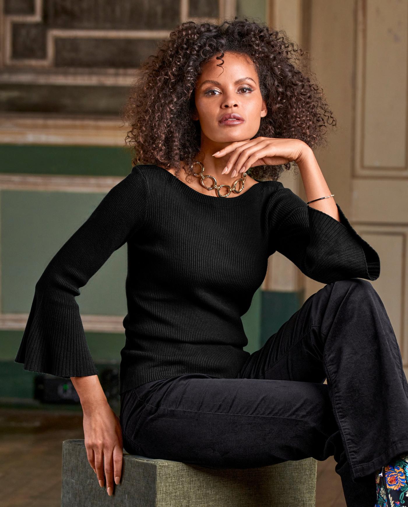 Ribbed Boatneck Flare Sleeve Sweater Black
