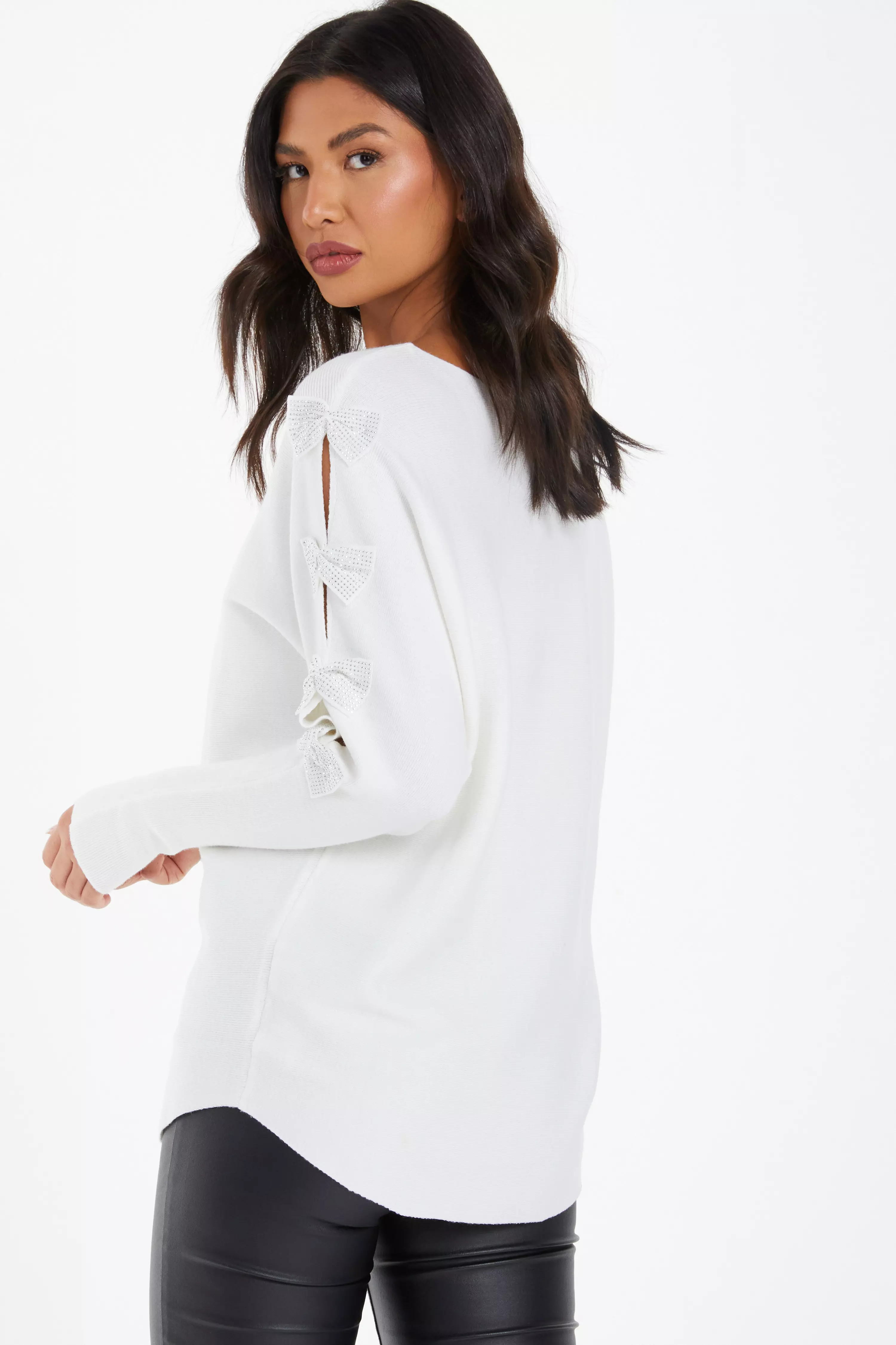 Cream Knit Diamante Bow Sleeve Jumper QUIZ Clothing