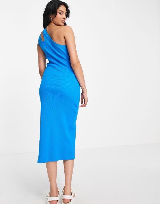 ASOS DESIGN ribbed midi dress with cut out one shoulder in bright blue