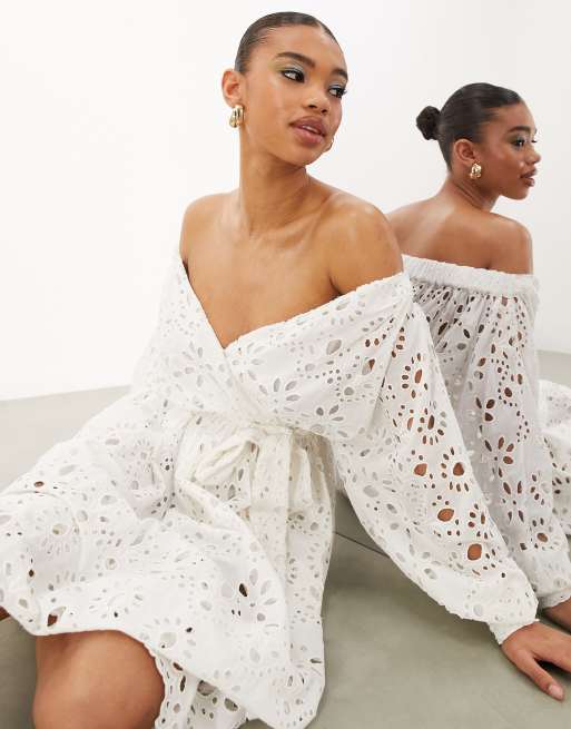 ASOS EDITION off shoulder broderie wrap belted midi dress in white