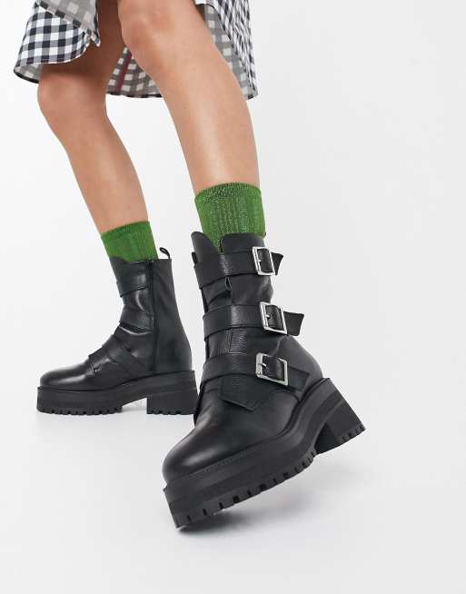 ASOS DESIGN Alex premium leather chunky buckle boots in black