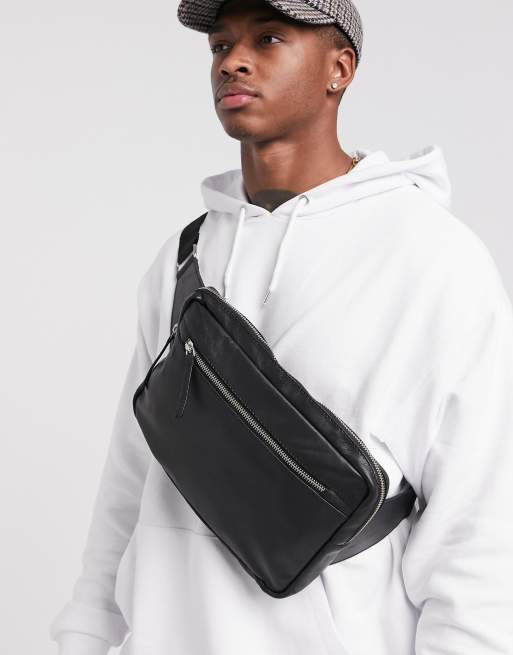 ASOS DESIGN leather cross body bum bag in black with front zip
