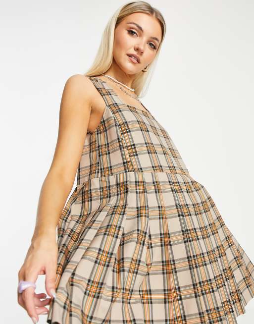 COLLUSION pleated mini pinafore dress in brown and orange check