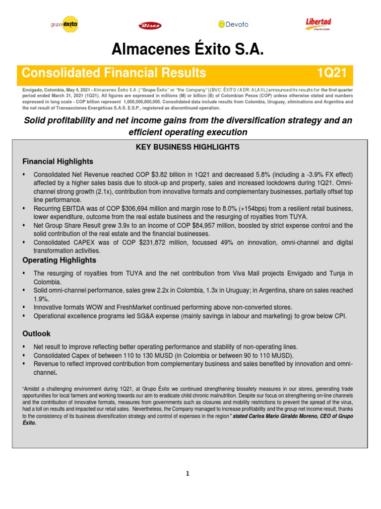 Almacenes xito S.A. Consolidated Financial Results 1Q21 PDF