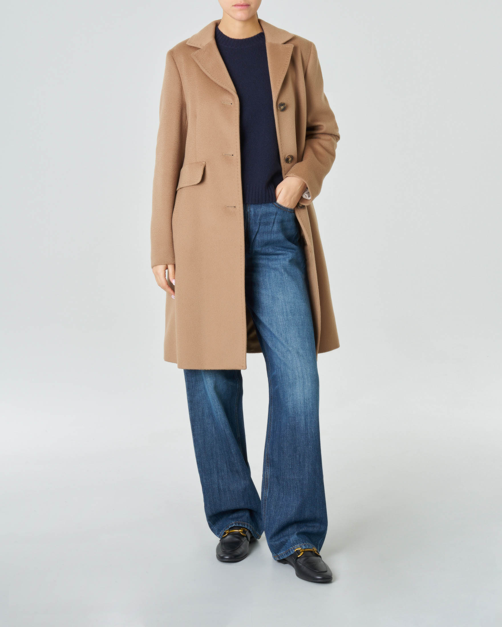 Cappotto color cammello in drap di pura lana vergine con scollo a