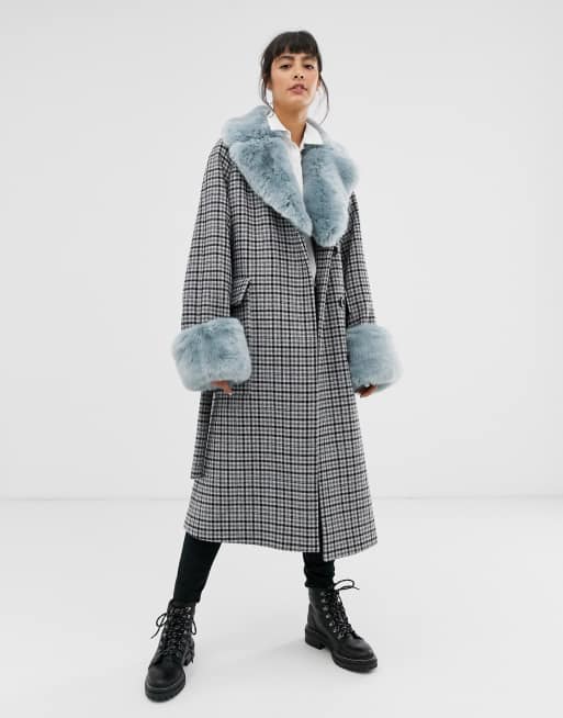 ASOS DESIGN faux fur collar check coat