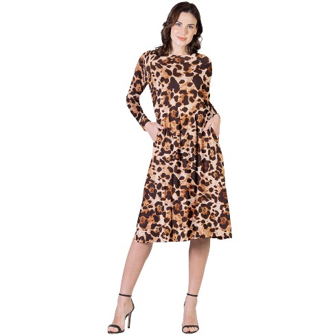 Womens Cheetah Print Long Sleeve Pleated Midi Dress With Pockets