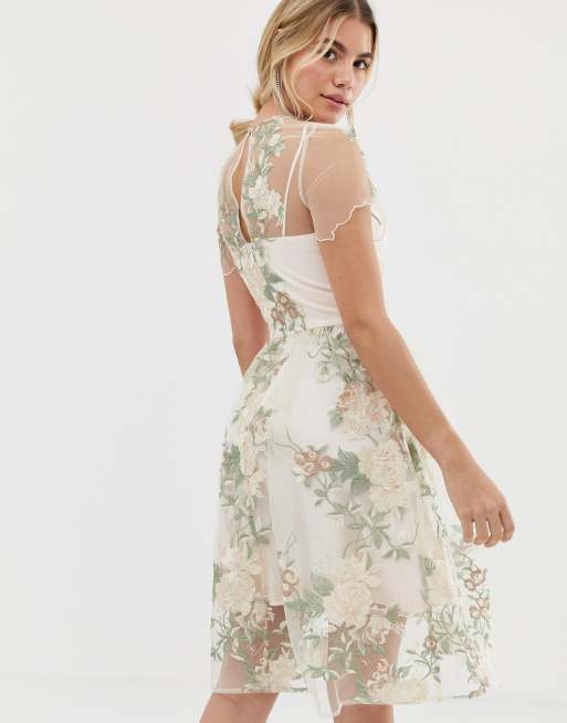 - chi chi london embroidered midi dress with sheer overlay in pink