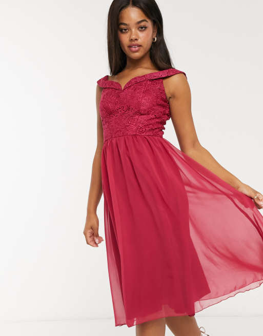 Chi Chi London lace soft bardot midi dress in berry ASOS