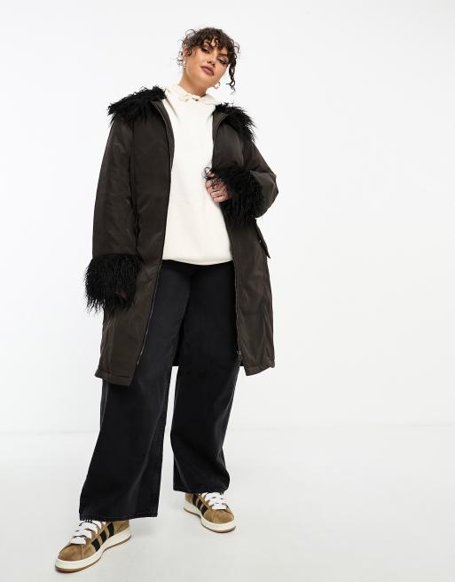 COLLUSION Plus nylon longline fur trim coat in brown with black faux fur