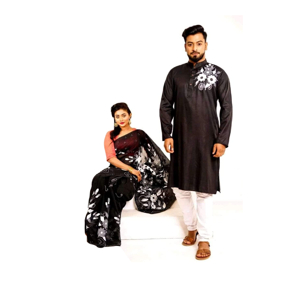 Half Silk Sharee and Cotton Punjabi Set For Couple CS 20 Black