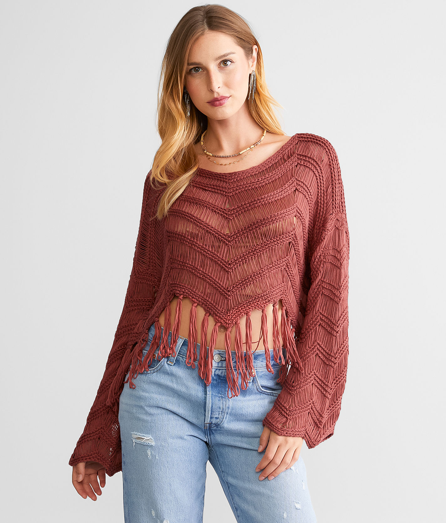 Very J Crochet Fringe Sweater Women s Sweaters in Rust Buckle