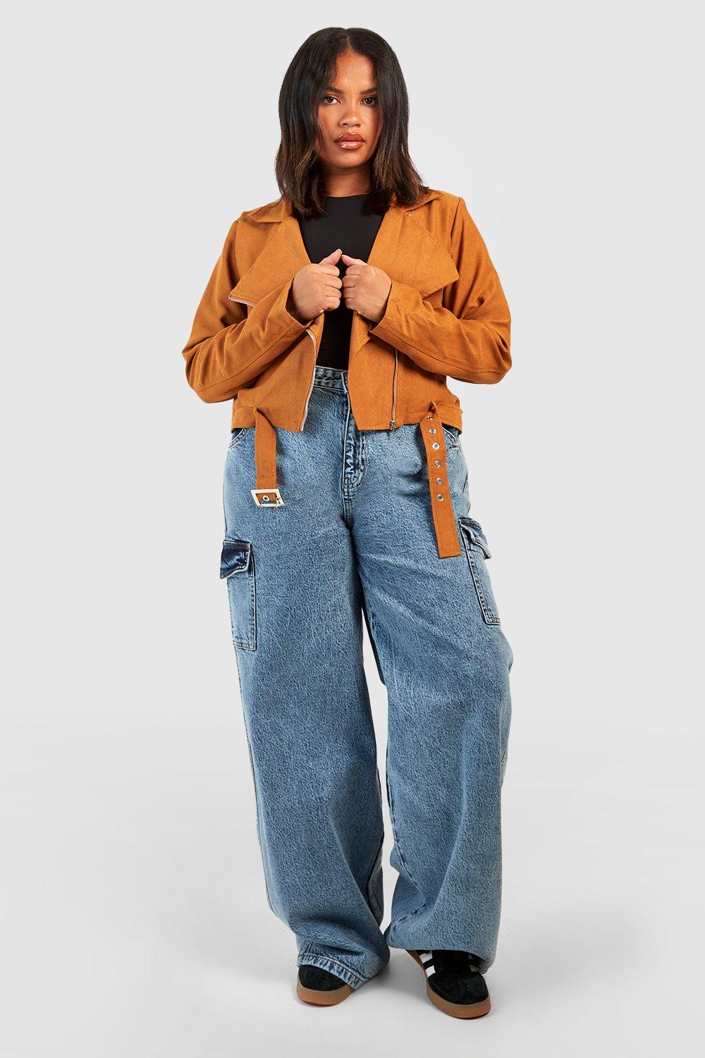 Cropped tan jacket clearance, Plus Belted Faux Suede Cropped Biker Jacket boohoo clearance