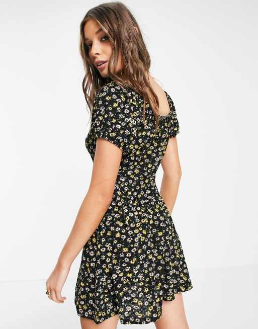 JDY milk maid mini dress in black daisy print
