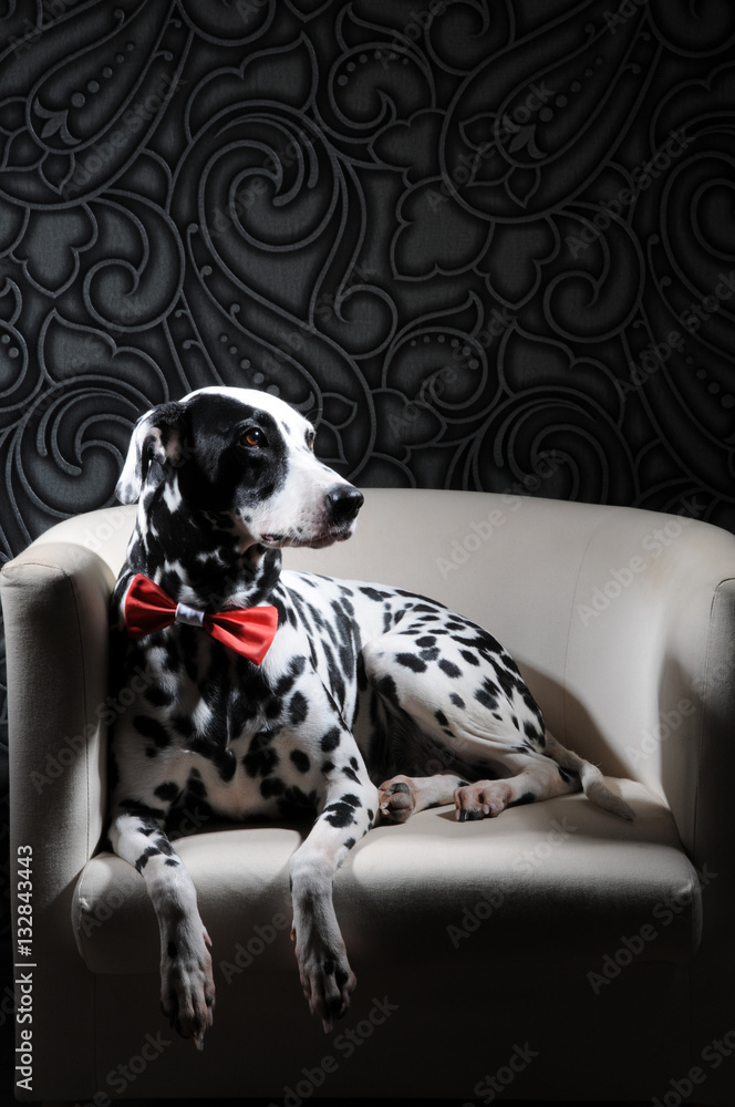 Dalmatian dog in a red bow tie on a white chair in a steel gray