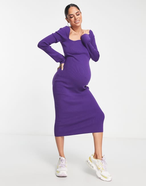 Dark purple midi dress clearance, The Frolic Maternity ribbed curved neckline midi dress in deep purple clearance