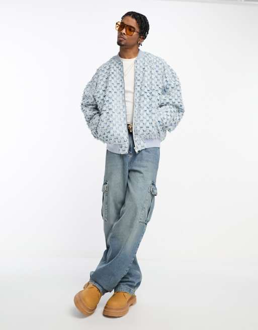 Denim bomber jacket mens clearance, Blue Jacquard Denim Bomber Jacket clearance