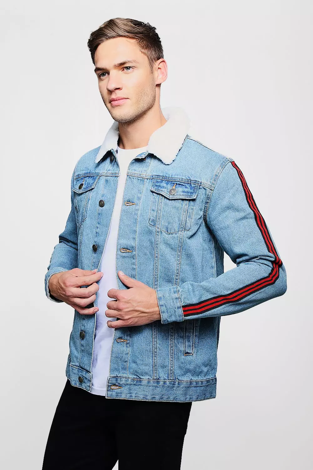 Side Stripe Denim Jacket with Borg Collar boohooMAN