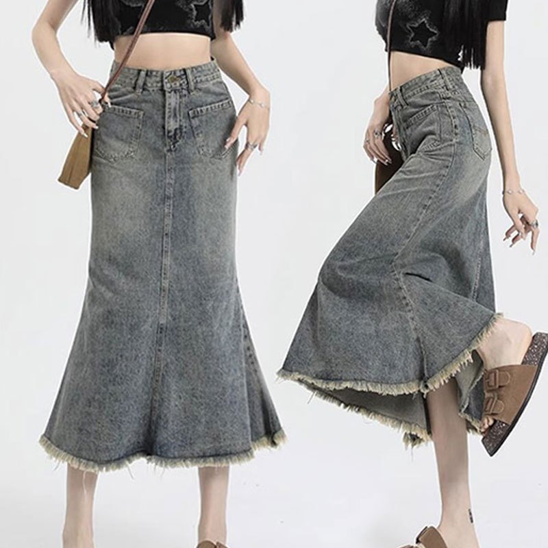 Denim skirt very clearance, denim skirt long for women sexy blue retro high waist A line clearance