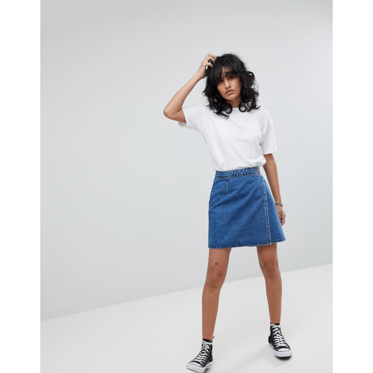 ASOS DESIGN denim wrap skirt in midwash blue