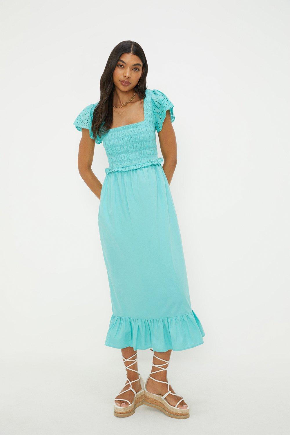 Dresses Turquoise Broderie Sleeve Shirred Midi Dress Dorothy