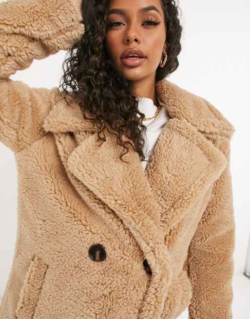 NA KD double breasted long teddy coat in beige ASOS
