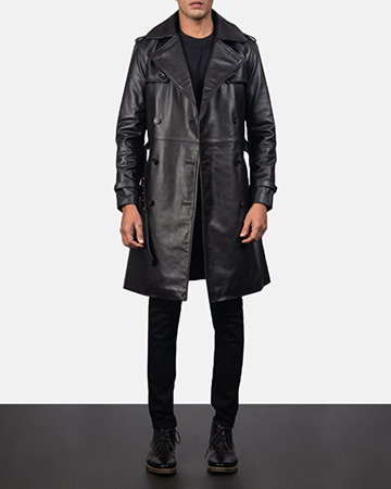 Men s Long Full Length Black Leather Button Front Trench Over coat