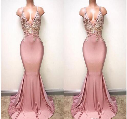 Dusty Pink Sexy Prom Dresses With Deep V Neck Appliques Beads