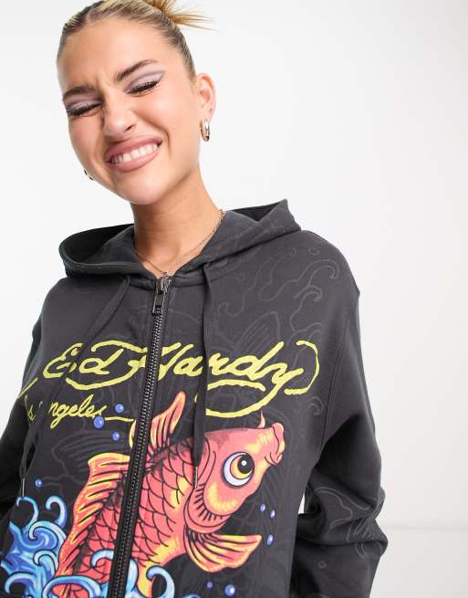 Ed Hardy relaxed zip through fleece lined hoodie with koi graphic
