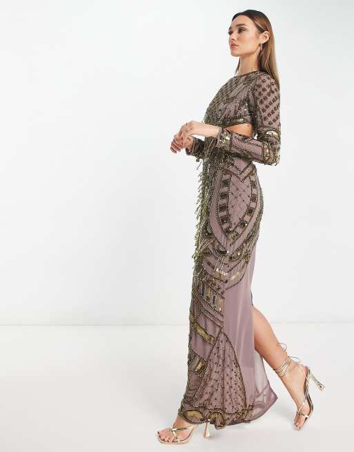ASOS DESIGN multi embellished maxi dress with cut out waist in mauve